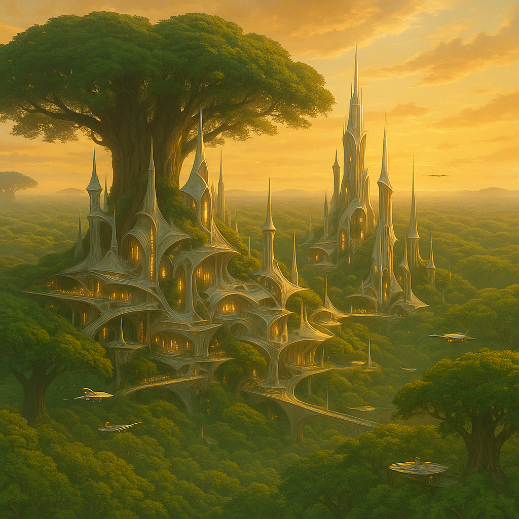 Etheos is the ancestral home of the elves, a large world dominated almost entirely by a single vast continent wrapped in endless forest. Towering trees cover the land from coast to coast, many of them rising to staggering heights—some spanning miles in breadth and climbing beyond the clouds. Only a few small mountain ranges interrupt the sweeping canopy, their slopes cloaked in green. Beyond the continent lies a boundless ocean that encircles the world.